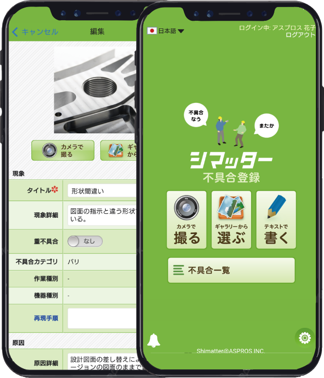 In many cases, problem management in manufacturing sites is currently managed by entering information into Excel files or on paper. However, such management is not accurate because it takes time to create reports and it is difficult to search and share past data. Shimatter is an app that allows you to easily manage and share problems that occur in manufacturing sites. By using Shimatter, you can immediately register and share information on the site when a problem occurs, and later use it for problem analysis and prevention of recurrence.