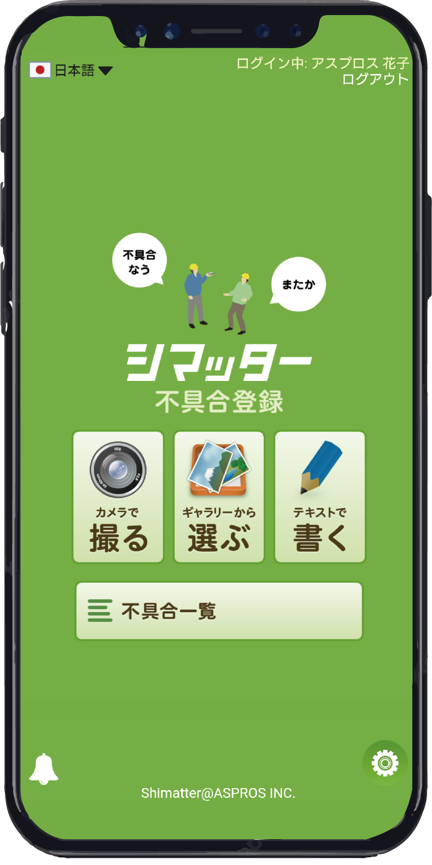 The top screen of Shimatter has only four buttons. Take a photo, select an existing image, or start by writing text. Anyone can easily post problem information from these three patterns.